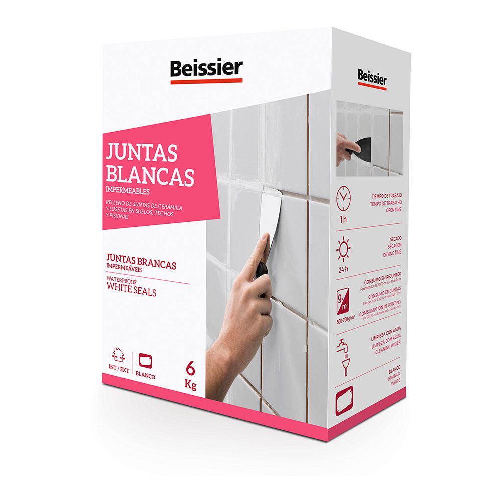 MASILLA PARA JUNTAS BLANCAS IMPERMEABLES 6 kg MORTERO ESPECIAL PARA RELLENAR E IMPERMEABILIZAR JUNTAS DE ANCHURA MÁXIMA DE 10mm EN SUELOS Y PAREDES. UTIL PARA REALIZAR JUNTAS EN TABIQUES Y MADERA (VENTANAS, PUERTAS, ETC.) RESISTENTE AL AGUA Y A LOS DETERGENTES. IMPERMEABLE E HIDROFUGO. FLEXIBLE. LIMPIEZA MUY FÁCIL. INDICADO PARA TRABAJAR EN SITIOS HUMEDOS COMO BAÑOS, COCINAS O PISCINAS, EN CONTACTO OCASIONAL O PERMAMENTE CON AGUA. CLASE CG2W SEGUN EN-13888. COLOR BLANCO. INTERIOR Y EXTERIOR.