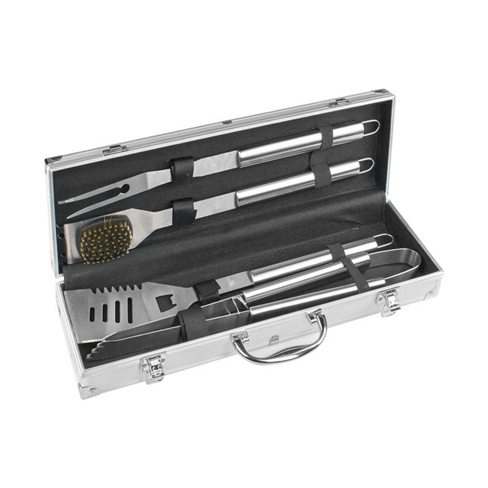 CONJUNTO DE 4 UTENSILIOS PARA BARBACOA. ACERO INOXIDABLE, EN CAJA DE ALUMINIO (46x16x8cm), SET 4 PZS: 1 PINZAS DE 43cm, 1 ESPATULA DE 43cm, 1 TENEDOR DE 43cm, 1 CEPILLO DE 43cm