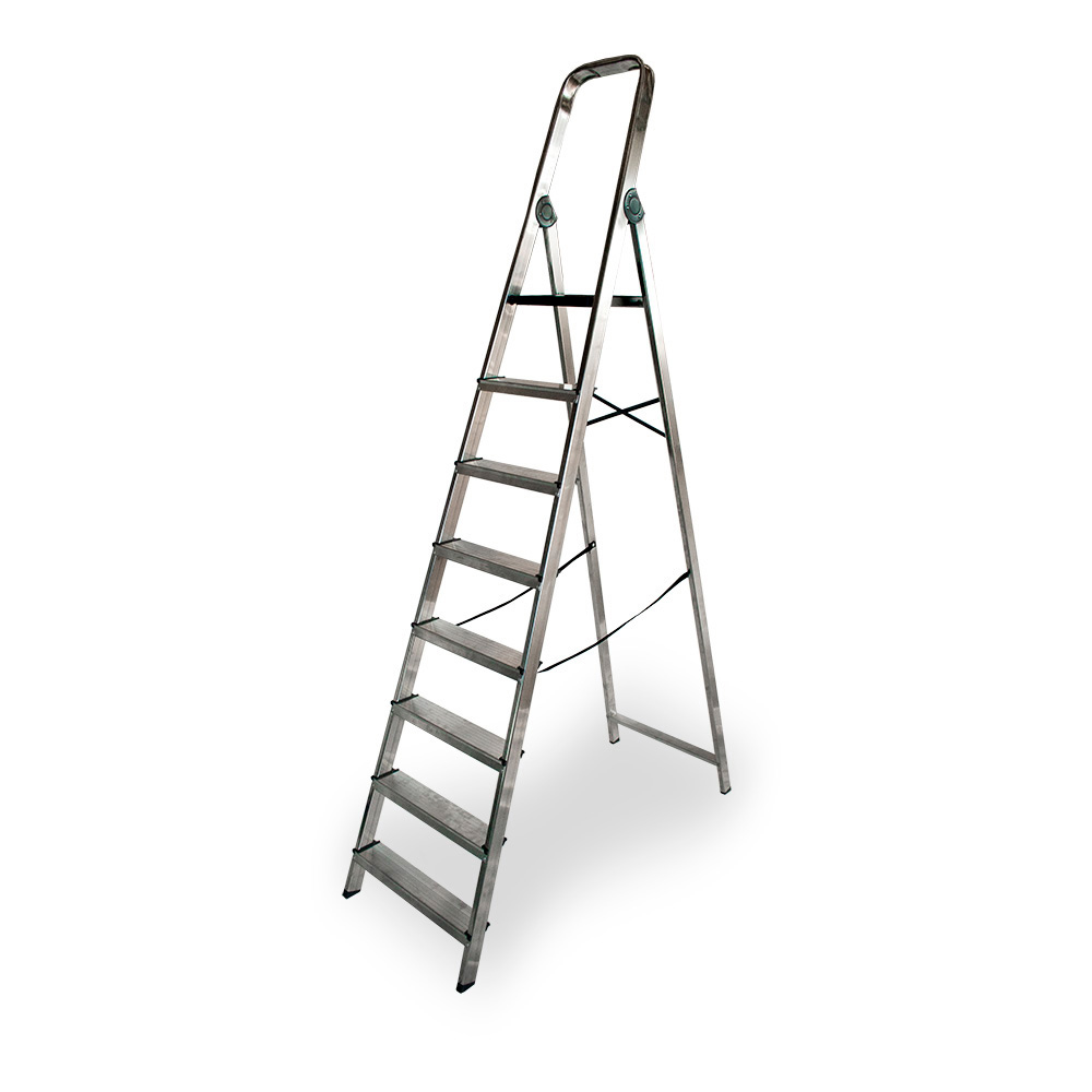 ESCALERA DOMÉSTICA DE ALUMINIO 8 PELDAÑOS. MEDIDAS PLEGADA: 52 x 11 x 241 cm, ALTURA DEL ÚLTIMO PELDAÑO 1,66 m. PESO DE LA ESCALERA: 6,3 kg, PESO MÁXIMO: 150 kg, LONGITUD MÁX EN USO 3,66 m. PLATAFORMA DE PP CON SISTEMA DE BLOQUEO EXCLUSIVO, BISAGRAS DE ALUMINIO Y PP. EN131