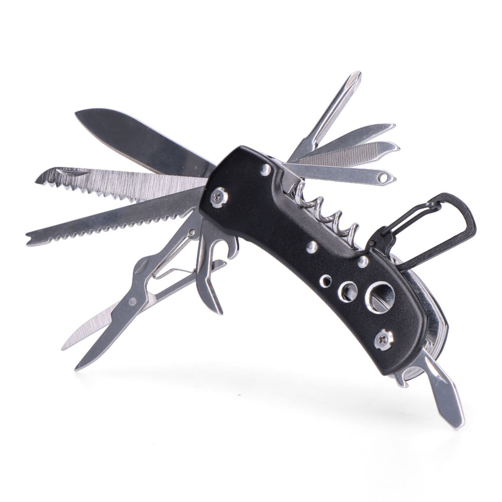 MULTIHERRAMIENTA MODELO NEGRO, CON MANGO DE ALUMINIO, HOJA DE ACERO INOXIDABLE 420, INCLUYE ESTUCHE DE NYLON Y ENGANCHE PARA CINTURÓN, CONSTA DE 12 HERRAMIENTAS: NAVAJA, SIERRA, LIMPIADOR DE ESCAMAS, TIJERAS, ABRELATAS, ABREBOTELLAS, SACACORCHOS, DESTORNILLADOR PHILIPS, ENHEBRADOR, PERFORADOR DE CUERO, LIMA DE UÑAS Y MOSQUETÓN, SERIE KILIMANJARO