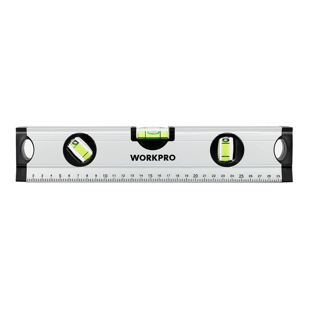 NIVEL DE BURBUJA 30cm. CONTERAS A PRUEBA DE GOLPES. ALEACIÓN DE ALUMINIO. PRECISIÓN 1mm/1m, 3 VIALES (45°/90°/180°). WORKPRO