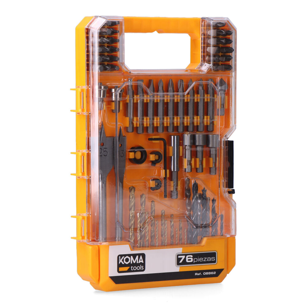 MALETÍN DE PUNTAS DE DESTORNILLADOR Y BROCAS; CONTIENE 76 PIEZAS. 12 BROCAS DE METAL HSS 4241 CON RECUBRIMIENTO TITANIO: 1,5(x2), 2(x2), 2,5(x2), 3-3,2-3,5-4-5-6 mm; 4 BROCAS MADERA ÓXIDO NEGRO: 3-4-5 Y 6 mm; 2 BROCAS PLANAS PARA MADERA: 13-25 mm; 4 PARA PARED: 3-4-5-6 mm; 34 PUNTAS 25 mm: S3-S4-S5(x2)-S6(x2)-S7-PH1(x2)-PH2(x4)-PH3(x2)-PZ1-PZ2(x2)-PZ3-T10-T15-T20-T25-T27-T30-T40-HEX2-HEX3-HEX4-HEX5-HEX6-S1-S2-S3. 9 PUNTAS 50 mm: S4-S6-S7-PH1-PH2-PH3-PZ1-PZ2-PZ3. PUNTAS PARA YESO LAMINADO 25 mm: PH2(x2). 3 VASOS HEXAGONALES: 6-8-10 mm; 1 PORTA PUNTAS IMANTADO; 1 AVELLANADOR 90º; 3 TOPES PARA BROCAS. MEDIDAS 25,5 x 3,6 x 17 cm