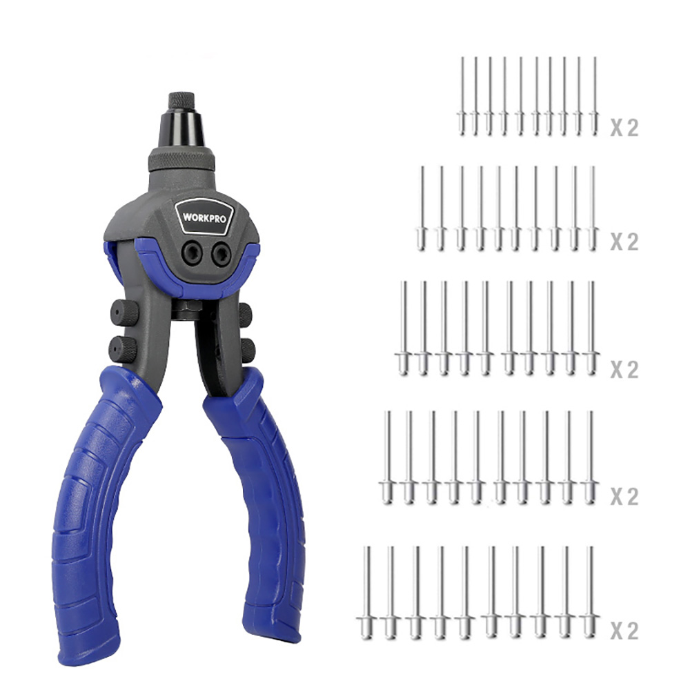 REMACHADORA MANUAL 250 mm (10″) . BOQUILLAS: 2.4 x 6 mm, 3.2 x 6 mm, 4.0 x 6 mm, 4.8 x 6 mm, 6.4 x 13 mm. MANGO ERGONÓMICO ANTIDESLIZANTE AZUL Y NEGRA